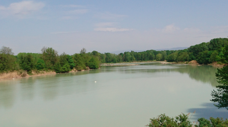 La confluence : au fond la montagne ardéchoise en bas de laquelle coule le Rhône
